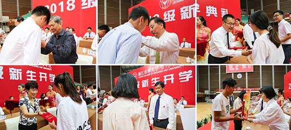 孙优贤、金佩华等在主席台前排就坐的领导为新生佩戴了院徽并为获得圆梦特别奖学金、新生奖学金的同学颁发了荣誉证书。