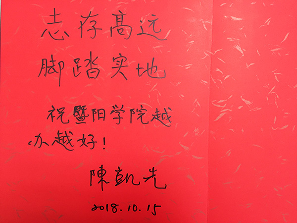 报告结束后,陈院士在论坛留言册上署名题词,寄语暨阳学子“志存高远、脚踏实地”,并在学院领导的陪同下参观了校园。