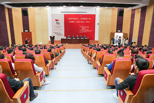 陈凯先院士以《加强中西医学结合发展现代健康产业》为题,结合理论研究和实践成果,以客观的分析和详实的案例,从健康产业发展的需求和中医药的优势、信息革命带来的创新机遇、弘扬中医特色发展健康产业、大力加强中药和保健品研究等四个方面作了详实阐述;深入浅出地剖析了当今社会面临的健康挑战,提出发挥中西医学各自优势、抓住大数据信息革命机遇、构建健康产业新模式、打造“移动健康”管理平台等建议与措施;分析了多种疾病的预防和治疗方法,他希望广大师生养成良好的饮食习惯和生活方式,并且成长为品质高尚、学业有成、身体健康、奋发向上的栋梁之才。