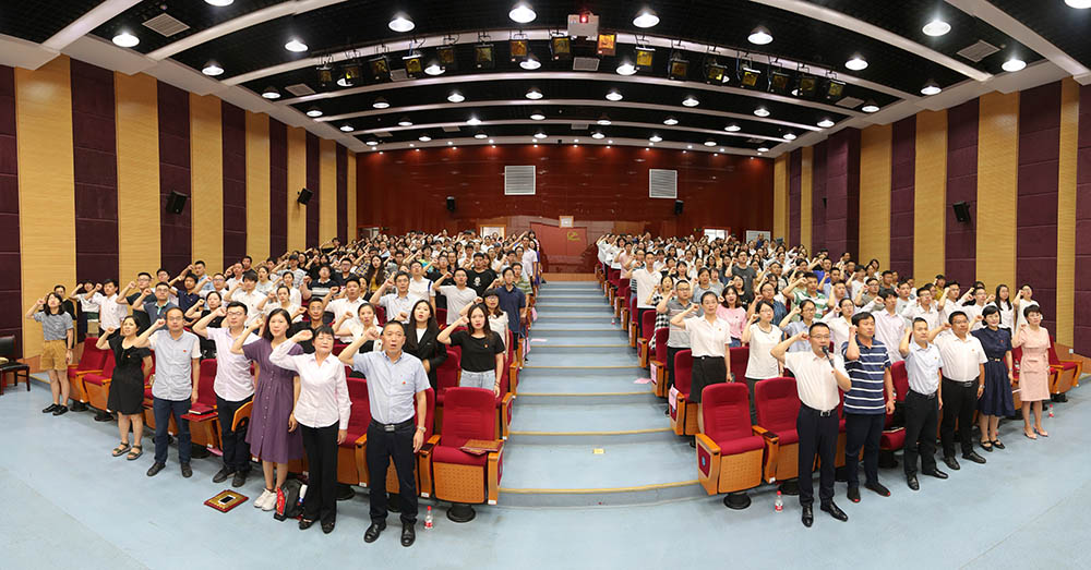 潘国忠书记为2019年新发展的预备党员代表佩戴党员徽章,希望全体党员牢记党员身份,始终以党员的标准严格要求自己,履行党员权利和义务,争做优秀党员。在潘国忠书记的领誓下,全体参会师生党员进行了集体宣誓仪式,重温了入党誓词。