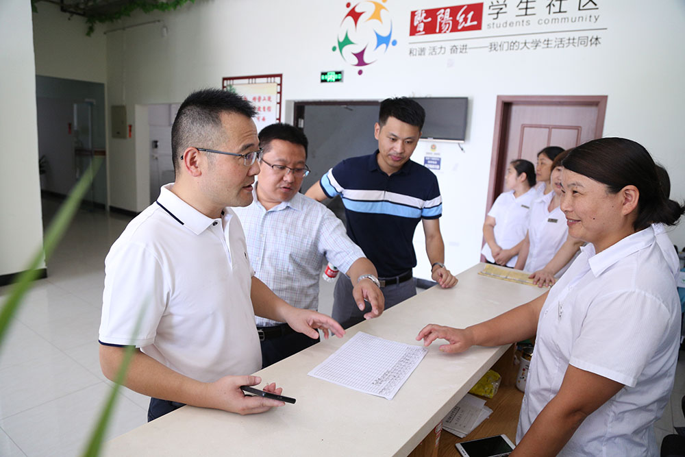院领导一行,走访慰问了学生社区、食堂、安保、物业等一线员工,详细了解了假期公寓住宿、就餐供应、施工维保和校园及周边安保等情况,强调要提高安全防范意识,加强日常巡视和进出人员的登记与管理,重点关注假期留校学生的安全,切实做好各项服务工作,并叮嘱他们在做好工作的同时要注意高温防暑。