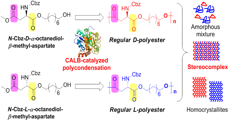 该论文提出立构复合结晶是互为立体异构体的高分子之间形成的R/S层层交替的特殊共结晶行为。与相应的同质结晶材料相比,复合结晶材料的熔点、耐热性、结晶能力、机械力学性能以及耐溶剂性能等均有大幅度改善。目前为止,具有立构复合物结晶性能的高分子材料种类仍然比较单一,除了聚乳酸之外具有立构复合结晶性能的聚合物主要为聚手性环氧丙烷碳酸酯或脂肪酸酯。针对当前立构复合高分子材料种类单一的局限,威廉希尔官网教师夏波设计一种具有脂肪长链的手性聚酯高分子材料,并详细考察了其立构复合结晶性能并实现了该手性聚酯的生物合成。由天冬氨酸-β-甲酯-α-辛二醇制得的D-构型和L-构型聚合物聚具有良好的结晶性能,其熔融温度Tm分别为49oC和56oC,D-构型和L-构型聚合形成的立构复合物熔融温度Tm提高约20oC。