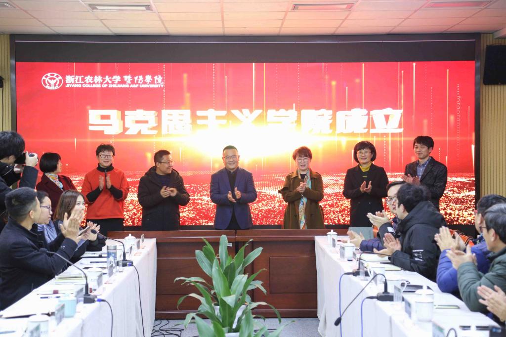 12月29日下午,williamhill官方网站英国威廉希尔公司马克思主义学院成立仪式在行政楼206隆重举行。学院党委书记潘国忠、副院长李文莉、副院长李叔君、党委副书记高国俊,国家哲学社会科学基金项目评审及成果鉴定专家、教授李勇华,浙江传媒学院马克思主义学院副院长许志红,浙江省科学社会主义学会副会长宋坚刚,诸暨市人大常委会委员、农经工委主任何君君,人文学院、马克思主义学院党政班子成员,相关职能部门负责人,二级学院党总支书记、副书记及师生代表出席成立仪式。仪式由副院长李文莉主持。