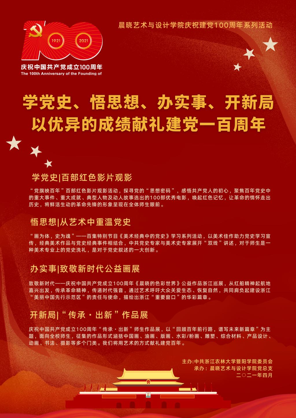 传承党员红色基因,促进党史理论学习,丰富全院师生生活,向党的百年华诞献礼。在建党100周年之际,学院党总支把学习党的百年光辉历程与学习党的各个时代节点、时代人物相结合,探寻党的“思想密码”,深刻理解中国共产党成立的历史必然性,感悟和体会共产党人的初心梦想、爱国爱党的真实情怀。积极推出“党旗映百年”百部红色影片观影活动,聚焦百年党史中的重大事件、重大成就、典型人物及动人故事选出的100部优秀电影,唤起红色记忆,让革命的情怀走出历史,将鲜活生动的革命先锋的形象呈现在晨晓艺术与设计学院全体师生眼前。
