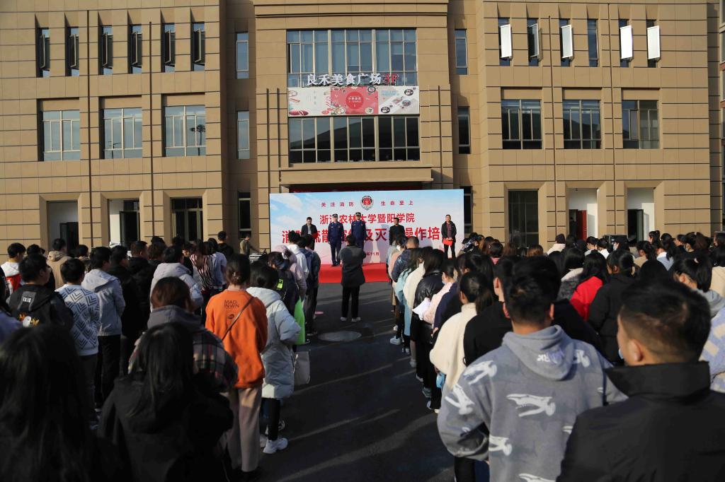 各二级学院(部、中心)、各部门负责人及师生代表,辅导员,卫生所医务人员,微型消防站工作人员,后勤、安保、社区工作人员,诸暨市消防救援大队官兵共计300余人参加了活动。