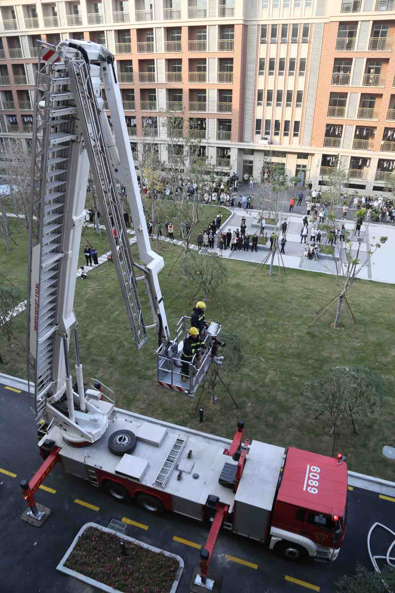 随后,徐光辉宣布消防疏散演练及灭火操作培训活动开始。学生公寓模拟着火点浓烟四起,学生发现火情后紧急呼救,立即拨打“校园110”并向119报警,学院迅速启动突发事件应急处置预案。2名公寓指导员作为第一灭火力量到达现场开展救援,楼层疏散引导员指挥学生用湿毛巾捂住口鼻快速有序撤离。微型消防站人员作为第二灭火力量紧急到达现场开展灭火救援。消防官兵接到报警后,迅速出警组成第三灭火力量进行救援。一组队员利用水罐消防车和室内消火栓对火势进行压制,掩护救援组深入火场救人,医务人员对受伤人员实施救治;另一组队员利用云梯车对被困人员实施高空营救。经过十余分钟的救援行动,快速扑灭了火情,成功救援出了被困人员,赢得了在场师生的掌声。