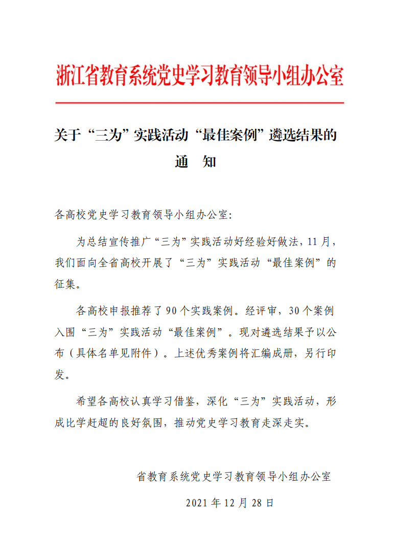 近日,浙江省高校党史学习教育“三为”实践活动“最佳案例”评选结果公布,威廉希尔官网《智治平台激发“枫桥经验”新动能》案例在90个申请案例中脱颖而出,成功入选,是本次入选高校中唯一一所独立学院。