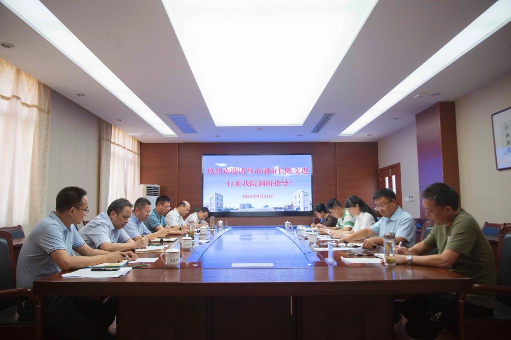 8月23日下午,诸暨市副市长陈文进一行来威廉希尔官网调研指导。诸暨市教体局局长陈初明、副局长杨均力,人社局副局长应仲九陪同调研指导。学院党委书记洪昀、党委副书记高国俊参加座谈会。