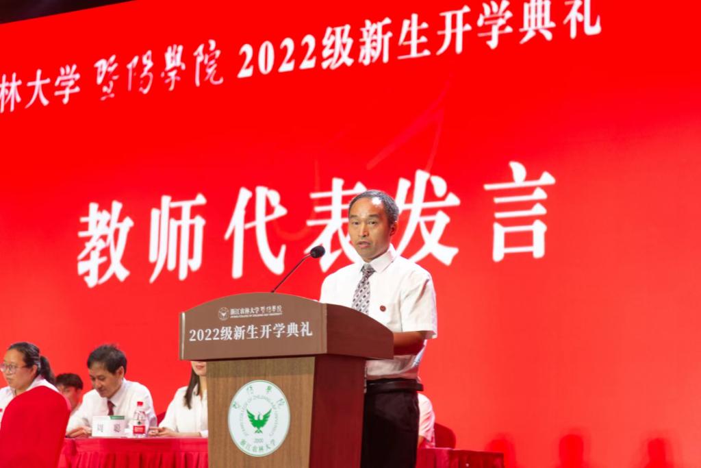 教师代表严国兵教授讲话,他寄语同学们学会多角度看待问题,分析问题,学会分辨真假,是非,善恶,获得独立思考的能力,在未来四年能够业有所精,学有所成。