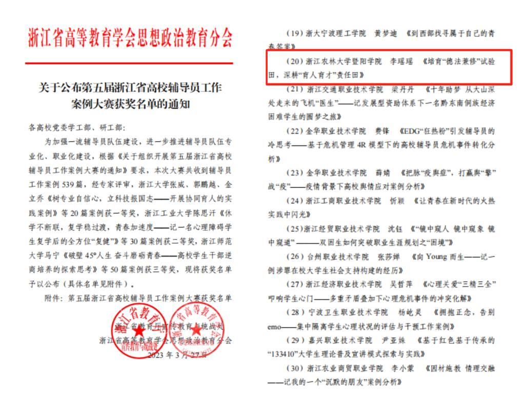 近日,省教育厅公布第五届浙江省高校辅导员工作案例大赛评选结果,学院辅导员李瑶瑶的《培育“德法兼修”试验田,深耕“育人育才”责任田》工作案例荣获二等奖。该案例以法学专业学生党支部“德法兼修”党建育人模式为例,把脉高校党建育人的普遍性问题和关键性规律,以贯彻落实立德树人为根本任务,积极融入“三全育人”大思政格局,发挥坚强有力的战斗堡垒作用,培养担当民族复兴大任的时代新人。