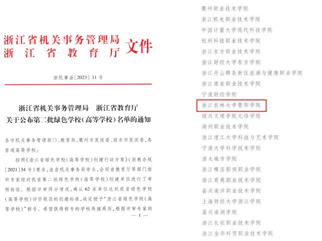 近日,浙江省机关事务管理局、浙江省教育厅联合公布第二批绿色学校(高等学校)名单,学院荣获“浙江省绿色学校(高等学校)”称号。