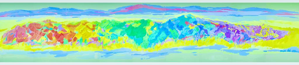 作品《新富春山居图》以长卷的形式描绘了“绿荷红菡萏”的秀丽景色——采用了48个亚洲国家地图图形勾绘,把水佩风裳的“荷”之貌表现得淋漓尽致,达到了“山川浑厚,草木华滋”的境界。即使晨晓患有“全症状神经性色弱障碍症”,大胆的色彩、果敢的线条、个性的形态无一不体现着他丰富的色彩世界和强大的精神内核,为杭州亚运会增添更为深厚的文化底蕴。