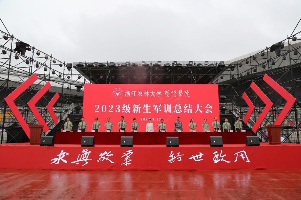 9月23日上午,学院举行2023级新生军训总结大会。全体参训同学踔厉奋发,气势昂扬,以饱满的精神面貌展示了14天的军训成果。学院党委书记洪昀,学院党委副书记、军训团政委、学院国防教育与军训工作领导小组组长高国俊,学院副院长、军训团团长李叔君,诸暨市人武部、军训团副团长金晓秋,以及军训团建制所有成员出席了总结大会。大会由高国俊主持。