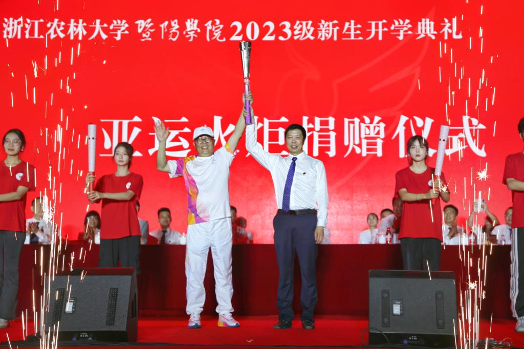 9月24日晚,williamhill官方网站英国威廉希尔公司2023级新生开学典礼在田径场举行。典礼上,杭州第19届亚运会火炬传递绍兴站第58棒火炬手、威廉希尔官网艺术学院名誉院长、中国好色彩代表人物晨晓捐赠了亚运会火炬。