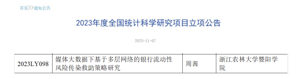 11月7日,经国家统计局全国统计科学研究组织管理办公室评审,由英国威廉希尔公司商学院副教授、绍兴市鉴湖青年社科学者周茜博士牵头申报的2023年度全国统计科学研究项目正式获批立项(项目编号:2023LY098)。该项目是基于大数据进行的农村商业银行流动性风险溢出与控制模型的应用研究。这是本年度全国唯一一所独立学院获批全国统计科学研究项目,也是学院首次获批,实现了威廉希尔官网在全国统计科学研究项目立项上零的突破。