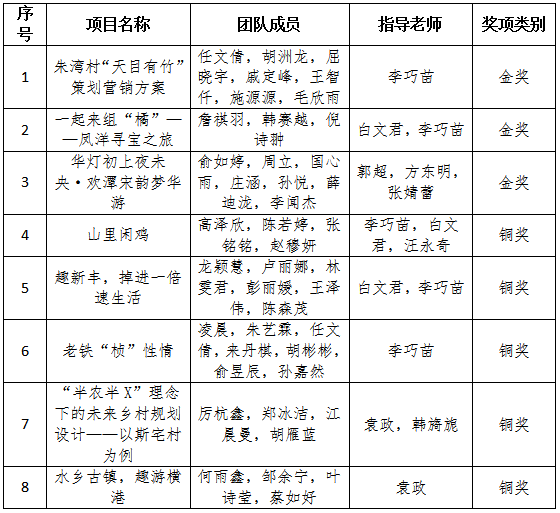 据悉,本届大赛于今年5月全面启动,全省共计有87所高校、1131支团队参与其中,大赛共收到包括乡村产业创意、乡村规划设计和乡村人文公益等类型作品共计1131件,最终角逐出金奖67项、银奖133项、铜奖204项。人文学院、马克思主义学院作品《朱湾村“天目有竹”策划营销方案》《一起来组“橘”——凤洋寻宝之旅》荣获主体赛乡村人文公益类金奖,园林学院作品《华灯初上夜未央·欢潭宋韵梦华游》项目荣获主体赛乡村规划设计类金奖。