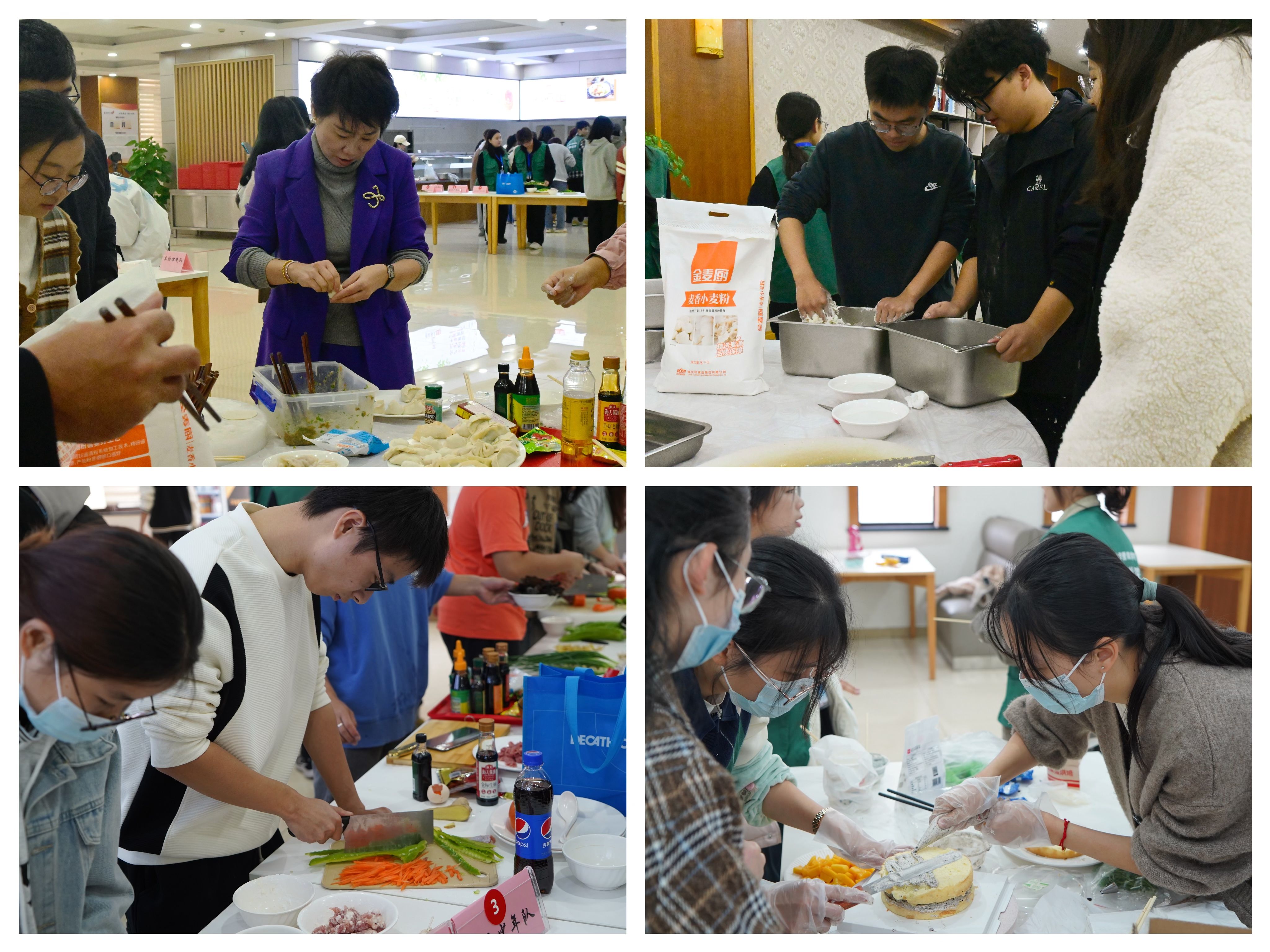 开幕式后举办了食品制作大赛。比赛以小组西餐制作、烹饪炒菜、饺子制作和蛋糕制作四种形式展开,共有来自各二级学院的28个小组参赛。参赛选手斗志昂扬、齐心协力,以饱满的热情进行了一场如火如荼的较量。经过两个小时的制作、现场评委和在场人员品尝及打分,西餐组、烹饪炒菜组、饺子组和蛋糕组前三名产生。参会领导为他们颁发荣誉证书。