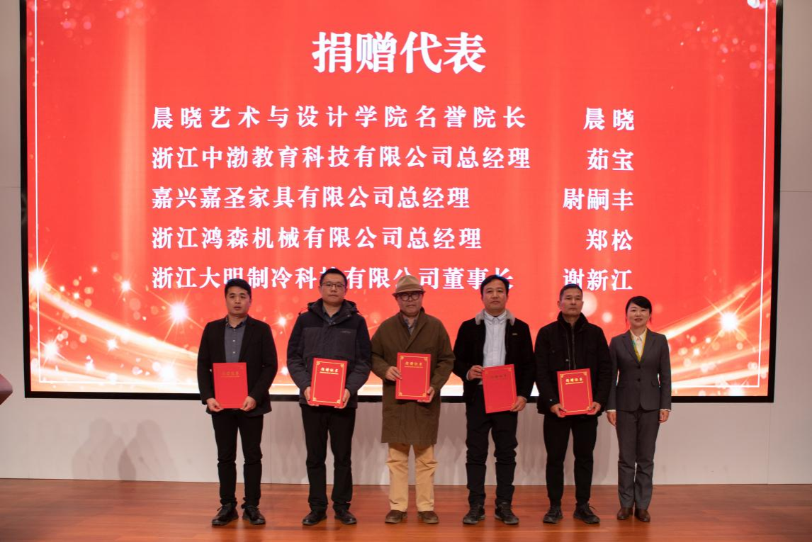 大会举行了捐赠仪式。晨晓艺术与设计学院名誉院长晨晓先生向学院捐赠慈善助学金36万元,浙江中渤教育科技有限公司总经理茹宝、嘉兴嘉圣家具有限公司总经理校友尉嗣丰、浙江鸿森机械有限公司总经理郑松和浙江大明制冷科技有限公司董事长谢新江捐赠总价值248万元人民币的教学资源和物资。
