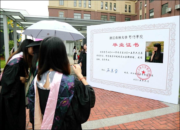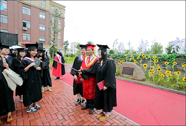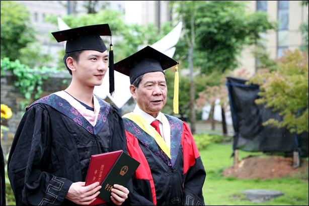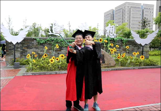 典礼仪式结束后,周国模校长、孙优贤院士和学院领导冒雨来到院士林,同毕业生和家长们合影留念。穿着学士服的毕业生们纷纷拿起自拍杆,在雨中和校长、院士、院长合影,留下人生最难忘的一刻。
