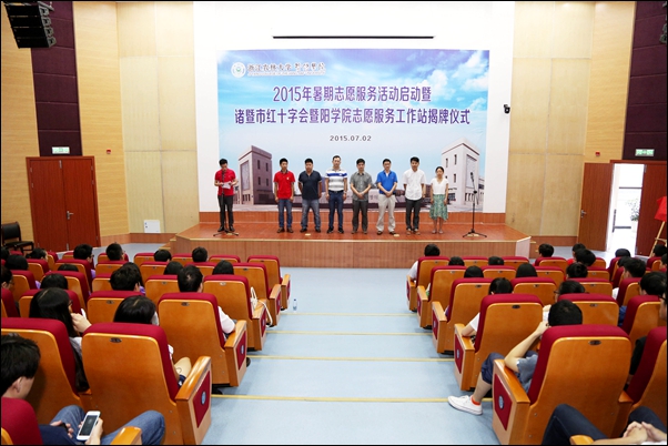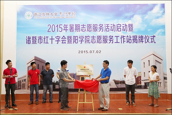 仪式上,办公室负责人和诸暨市红十字会执委会副主任共同为诸暨市红十字会英国威廉希尔公司“志愿服务工作站”揭牌;学工部、团委相关负责人宣读了2015年暑期社会实践立项团队名单,并作了安全培训。