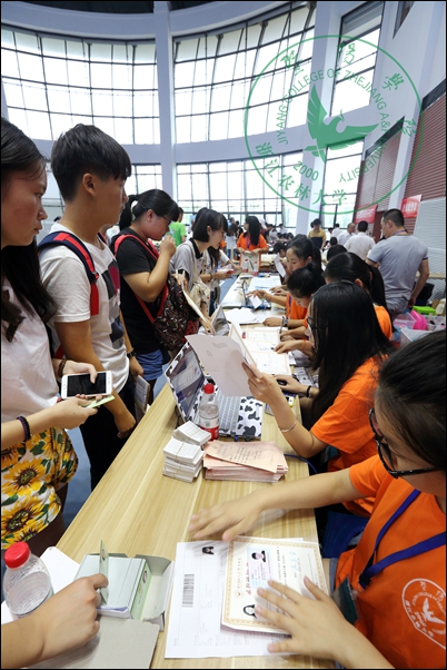 “欢迎你新同学,请出示你的录取通知书和身份证”、“同学,学费收据请收好”、“同学,这是你的一卡通和寝室号”、“同学你好,我是你的辅导员,这是我的联系卡,有事随时可以联系我”……当每位新生进入报到服务大厅各系报到点办理入学报到手续时,辅导员和志愿者们平均用1分钟时间完成了“验证——查给——注册——统计——复查——发放”等报到服务工作。