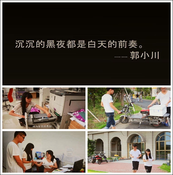 作品《白天的前奏》讲述的是关于家庭经济困难学生们的奋斗故事。虽然现在勤工俭学的生活很辛苦,家庭经济的困难如黑夜般漆黑,但始终怀着梦想不懈努力的他们始终坚信,如“白天”般的美好未来终究会来临,因为黑夜是白天的前奏。而白天的来临不仅依靠自己的奋斗与创造,国家助学金更是给他们带来了无限的希望,让他们能够继续走下去。
