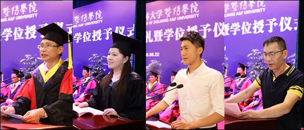 毕业典礼上,教师代表姚文斌,毕业生代表齐天虹,在校生代表周东敏,毕业生家长代表李翊飚先后发言。
