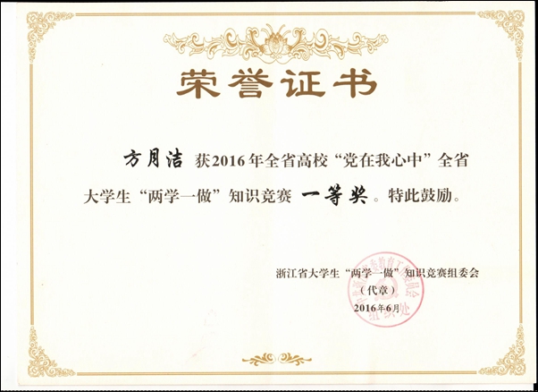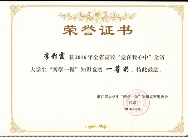 本网讯 日前,从浙江省大学生“两学一做”知识竞赛组委会获悉,“党在我心中”全省大学生“两学一做”知识竞赛顺利落幕。威廉希尔官网园林艺术系方月洁、人文系李彩霞两位同学荣获一等奖。
