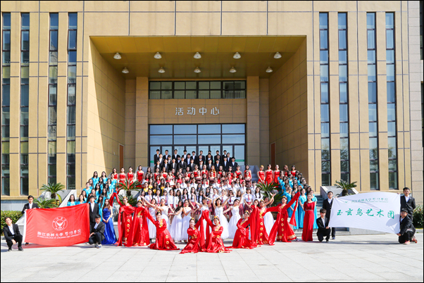 “玉玄鸟”大学生艺术团在学院迁址办学的新形势下,抢抓机遇,主动作为,创新发展,争做大学文化传承与发扬、引领与创新的排头兵。争当服务公共文化建设、丰富群众文化生活的标兵。积极打造文化直通车,服务地方文化礼堂建设,把大学文化送到基层一线,累计下乡已达58场,为大学文化进诸暨做出了示范与引领。创作编排并巡回演出大型廉政舞台剧《郑义门》,让“两学一做”学习教育在“学”得生动中“以文育人”、在“做”得精彩中“以文化人”,引导师生学习、倡导、践行廉政文化和良好家风,营造了健康向上、格调高雅的育人氛围。争当开展艺术教育实践、营造校园文化氛围的标兵。三年来,为元旦文艺晚会、校园十佳歌手、闪耀之星评选、各系文艺交流晚会培养和输送了500余名文艺骨干,成为校园文化生活不可或缺的一支骨干力量。争当发挥文化育人功能、锤炼学生综合素质的标兵。积极搭建大学生践行社会主义核心价值观、投身社会实践、锤炼综合素质、服务诸暨人民的广阔舞台,在服务地方文化建设、繁荣校园文化活动、丰富师生文化生活做出了积极贡献。