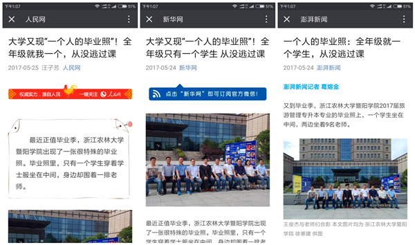 新华网:大学又现“一个人的毕业照”!全年级只有一个学生从没逃过课!