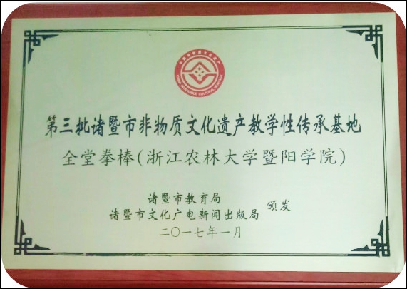 “全堂拳棒”即“全堂国术”,该教学性传承基地的成立是威廉希尔官网实施大学文化进诸暨“五个一”工程之打造“一批地域特色文化精品”的重要呈现,是威廉希尔官网在传承与保护诸暨市非物质文化遗产、弘扬“全堂国术”优秀传统文化的阶段性成果。自2015年12月“全堂国术”团在威廉希尔官网成立以来,全堂村“全堂国术”团杨广团长、枫桥镇全堂小学骆卫安校长担任威廉希尔官网“全堂国术”团顾问,“全堂国术”团资深教练杨银铨先生为校外指导教师,校内外“全堂国术”团合力共建,取得了一定的成绩,产生了较好的影响。学院师生演绎的“全堂国术”亮相元旦文艺晚会,组建的“全堂国术非遗传承”暑期社会实践团实现了“一篇调研报告+一支大学生国术队+一个影像资料+一本教学拳谱”的初步目标,掀起了广大师生知晓“全堂国术”、学习“全堂国术”、实践“全堂国术”的热潮,为共同保护诸暨市非物质文化遗产、弘扬“全堂国术”优秀传统文化发挥着传承和引领作用。