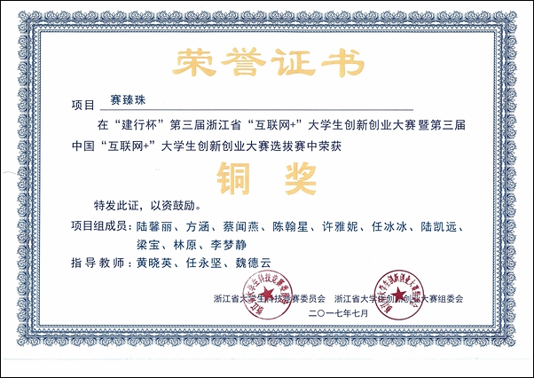 本网讯 近日,从第三届浙江省“互联网+”大学生创新创业大赛组委会获悉,威廉希尔官网共报送2支创业项目团队均首次入围省级决赛,其中,“赛臻珠”团队首次荣获第三届浙江省“互联网+”大学生创新创业大赛铜奖。