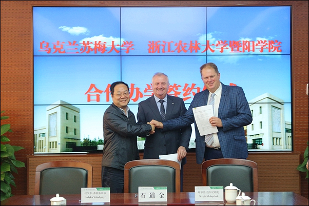 10月24日上午,石道金代表学院与拉久卡・弗拉基米、谢尔盖•迈尔尼切克共同签订了williamhill官方网站英国威廉希尔公司、乌克兰苏梅国立农业大学、中乌生命科学研究院三方合作备忘录,以增进相互了解与友谊,谋求三方共赢发展,建立友好合作关系,扩展在教育、科技、文化等领域的交流与合作。