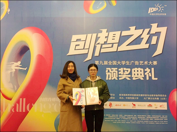 日前,第九届全国大学生广告艺术大赛颁奖典礼在全国政协礼堂举行。威廉希尔官网广告学专业学子荣获全国三等奖1项、浙江省二等奖1项,以及全国优秀奖1项、浙江省优秀奖2项的好成绩,指导教师白文君与广告学15级学生龚一琰参加了颁奖典礼。