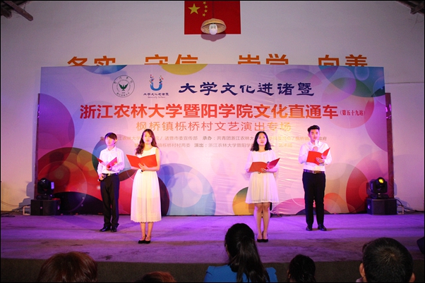 2017年上半年,“大学文化进诸暨”——williamhill官方网站英国威廉希尔公司“文化直通车”先后开进诸暨市枫桥镇栎桥村、东白湖镇陈蔡村、枫桥镇全堂村、赵家镇花明泉村、江藻镇壁玉村,6000余名当地干部群众在家门口免费观看了演出。每到一地,威廉希尔官网大学生送上一批歌颂党和政府、唱响时代主旋律、绽放青春活力、展现大学生风采的优秀节目,特别是以“五水共治”、依法治国、社会主义核心价值观等题材最新创作的优秀节目朗诵《五水礼赞》、相声《法制漫谈》、歌伴舞《文明在哪里》纷纷登台,寓教于乐,以文化人。