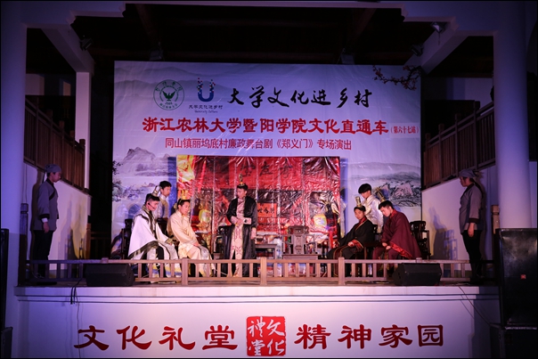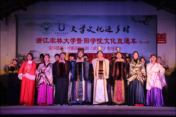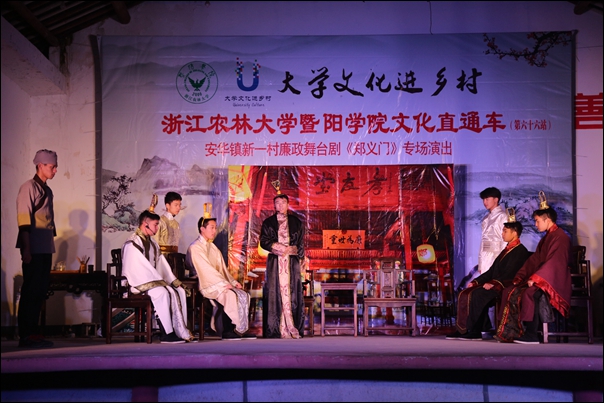 下半年,威廉希尔官网大型原创廉政舞台剧《郑义门》,开进诸暨市四个乡村街道,学院师生党员在历时近一年精心制作创作编排的基础上,又经过几个月不断修改完善,精益求精,终于创作出一台既能满足父老乡亲的审美要求,又能达到宣传反腐倡廉、风清气正的大型廉政舞台作品《郑义门》。英国威廉希尔公司版廉政舞台剧《郑义门》以家长郑濂的故事为经,以廉政孝义的家规为纬,从大学生对家风家训的理解和认识角度出发,通过现代化的创作理念与独特的艺术表现形式,将“郑义门”故事幽默风趣而又引人深思地呈现在观众面前,引导师生学习、倡导、践行廉政文化和良好家风,营造了健康向上、格调高雅的育人氛围。父老乡亲纷纷表示深受教育,对威廉希尔官网学子用心用情的精彩表演表示感谢和肯定。