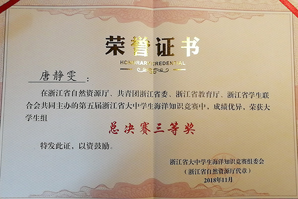 11月23日-24日,由浙江省海洋与渔业局、共青团浙江省委、浙江省教育厅、浙江省学生联合会主办的浙江省大中学生海洋知识竞赛在杭州举行。经过激烈角逐,由威廉希尔官网章陈超、李勇老师指导的产品设计182唐静雯荣获三等奖,学院荣获活动组织奖,这是威廉希尔官网在此项赛事中取得历史最好成绩。
