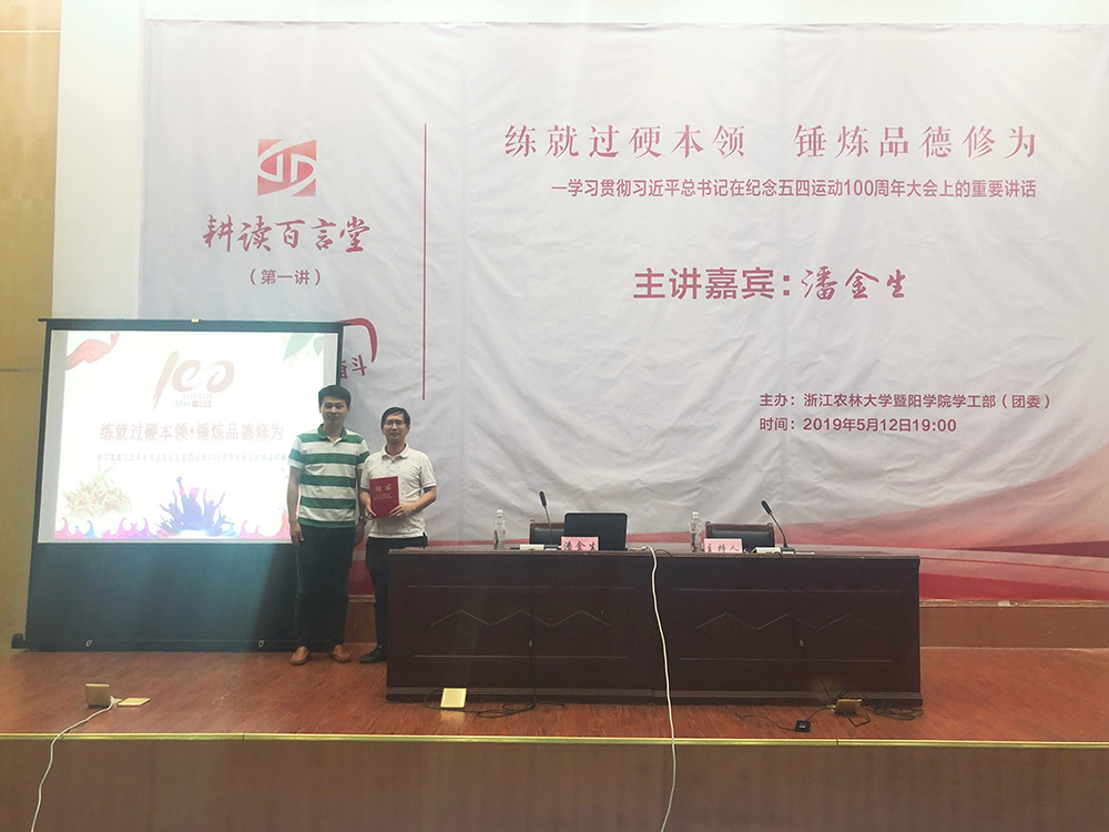 5月12日晚,学院“耕读百言堂”第一讲在图书馆报告厅举行。报告邀请海亮集团有限公司纪委书记、团委书记,共青团十七届中央委员潘金生作“练就过硬本领,锤炼品德修为”专题报告,报告内容围绕学习贯彻习近平总书记在纪念五四运动100周年大会上的重要讲话精神展开。学院学工部负责人,团学指导老师及各学生组织近230位学生骨干参加。