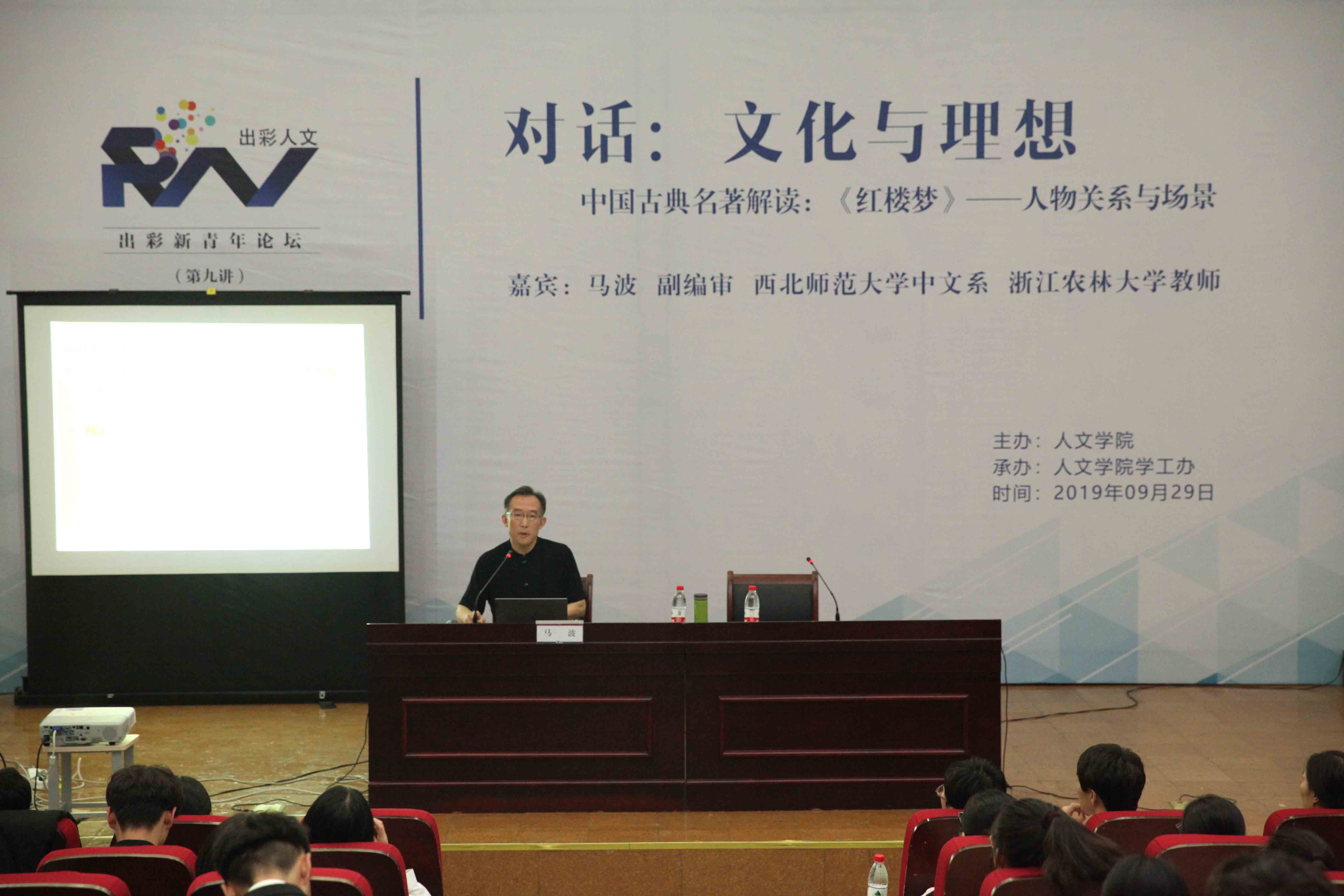 放飞青春梦想,成就出彩人生。9月29日晚,人文学院在人文楼4110举行了出彩新青年论坛第九讲。副编审、西北师范大学中文系、williamhill官方网站教师马波老师作客论坛,与我们分享了他对中国四大名著之一《红楼梦》的人物关系场景的解读。人文学院院长刘伯茹、党总支书记宣王威、学生办全体辅导员、人文学院团学学生干部、2019级新生等250余人出席本次论坛。