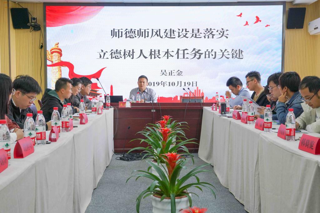随后,纪委书记吴正金以“师德师风建设是落实立德树人根本任务的关键”为主题,强调了加强师德师风建设的重要性、介绍了师德师风典型案例,以及分享了提高自身师德修养的途径。