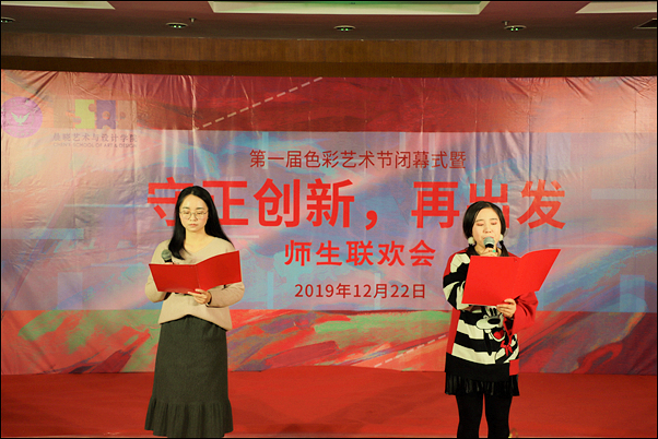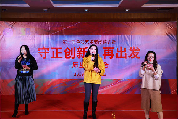 晨晓在闭幕式上致辞,代表晨晓艺术与设计学院向一直以来关心和支持学院建设发展的校外友好合作单位表示感谢,向筹备、组织本次活动而辛勤付出的师生工作人员表示慰问,向参加活动的全场观众致以诚挚的节日祝福和新年祝贺,并宣布晨晓艺术与设计学院第一届色彩艺术节闭幕,预祝联欢会取得圆满成功。