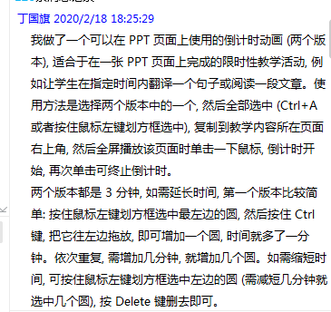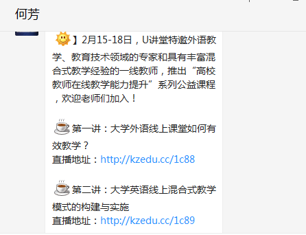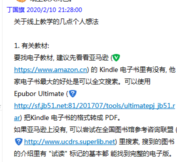 为了使在线教学更加平稳有序地开展,威廉希尔官网丁国旗老师通过前期的摸索和实践,总结在线教学平台的经验,及时在人文学院群提供了有关在线教学的意见和建议共几十条,涉及平台选择、电子书的购买、文档的转化、软件操作要领等;何芳老师也通过网上资料的搜索,及时分享了在线教学的经验和体会。