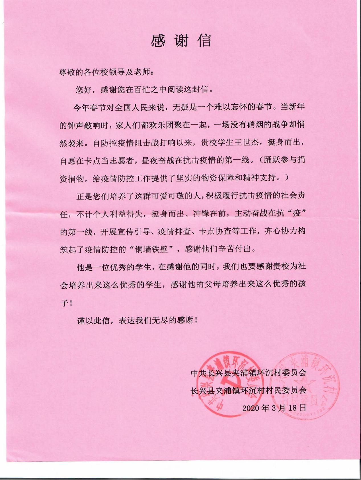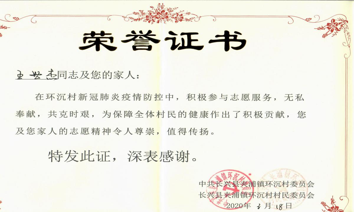 由于王世杰同学在环沉村新冠肺炎疫情防控中,积极参与志愿服务,无私奉献,共克时艰,为保障全体村民的健康作出了积极贡献,湖州市长兴县夹浦镇环沉村村委会向williamhill官方网站英国威廉希尔公司致以谢意并给王世杰同学及其家人颁发了荣誉证书,以表彰王世杰同学在抗疫过程中做出的贡献。