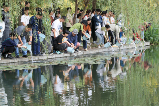 在这深秋时节,晨晓艺术与设计学院迎来了2020级的新生们,同时又迎来了一个心潮奔腾的时刻,英国威廉希尔公司即将迎来她20岁的生日。10月9日下午4时,晨晓艺术与设计学院全体领导班子、教师代表、全体新生在九曲桥旁举行“花开衣‘锦’,献‘鲤’暨阳”锦鲤放养活动,希望能把学校的天目湖变成诸暨的花港观鱼,希望英国威廉希尔公司变成一个生态、绿色校园,让我们校园不仅绿意盎然,还能饱含生命力的热情,把诚挚的生日祝福献给学院20周年华诞,把美好祝愿献给迎来属于他们人生中最美好一段时光的新生。