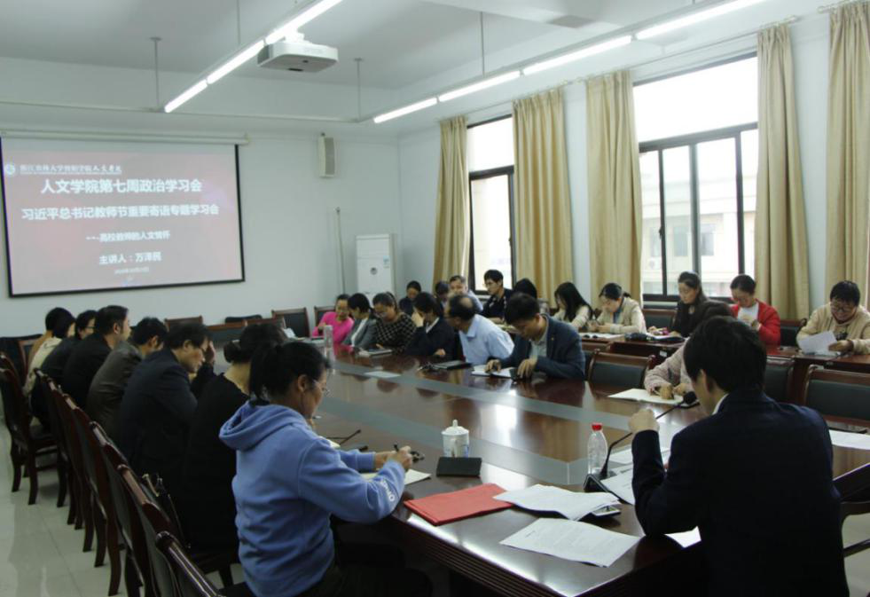10月29日下午,人文学院在人文楼3502会议室召开本学期第七周政治学习会,专题学习了习近平总书记教师节重要寄语的重大意义和深刻内涵,马克思主义教研部主任在学习会上畅谈了题为《高校教师的人文情怀》的感悟。人文学院院长、党总支书记以及全体教师参加会议。会议由党总支书记主持。