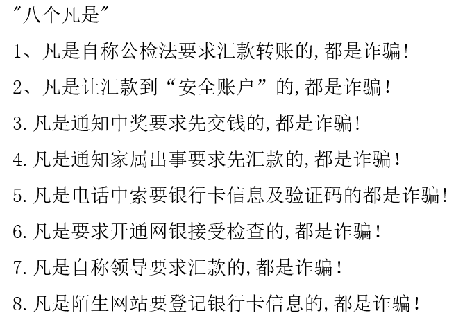 警官们教育同学们要防范在先、警惕在前,必须要警于思、合于规、慎于行。并向同学们传授了预防诈骗小知识之"六个一律"和"八个凡是"。