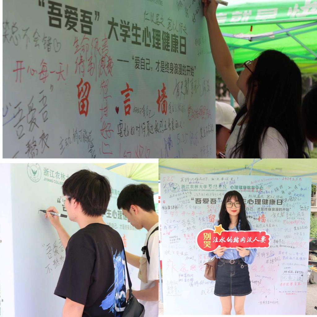 活动现场围绕“人际关系”和“心理健康”展出心理知识宣传展板和发放温馨心语系列书签,普及心理健康知识。生活需要一些爱的仪式感,爱自己亦然。心理互助委员会工作人员在食堂门口宣传心理健康知识的同时,邀约同学们在“爱”的留言墙留下“阳光心情寄语”,定格“吾爱吾”美好瞬间。