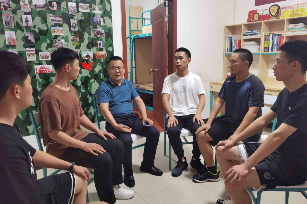 在退伍军人特色寝室,潘国忠和同学们亲切交谈,详细询问他们部队、学习、生活等情况,鼓励同学们不忘初心,传承部队里的优良作风,将学习与党史相结合,把党史学习教育成果体现在学习生活中,做到退伍不褪色、退役不退志。