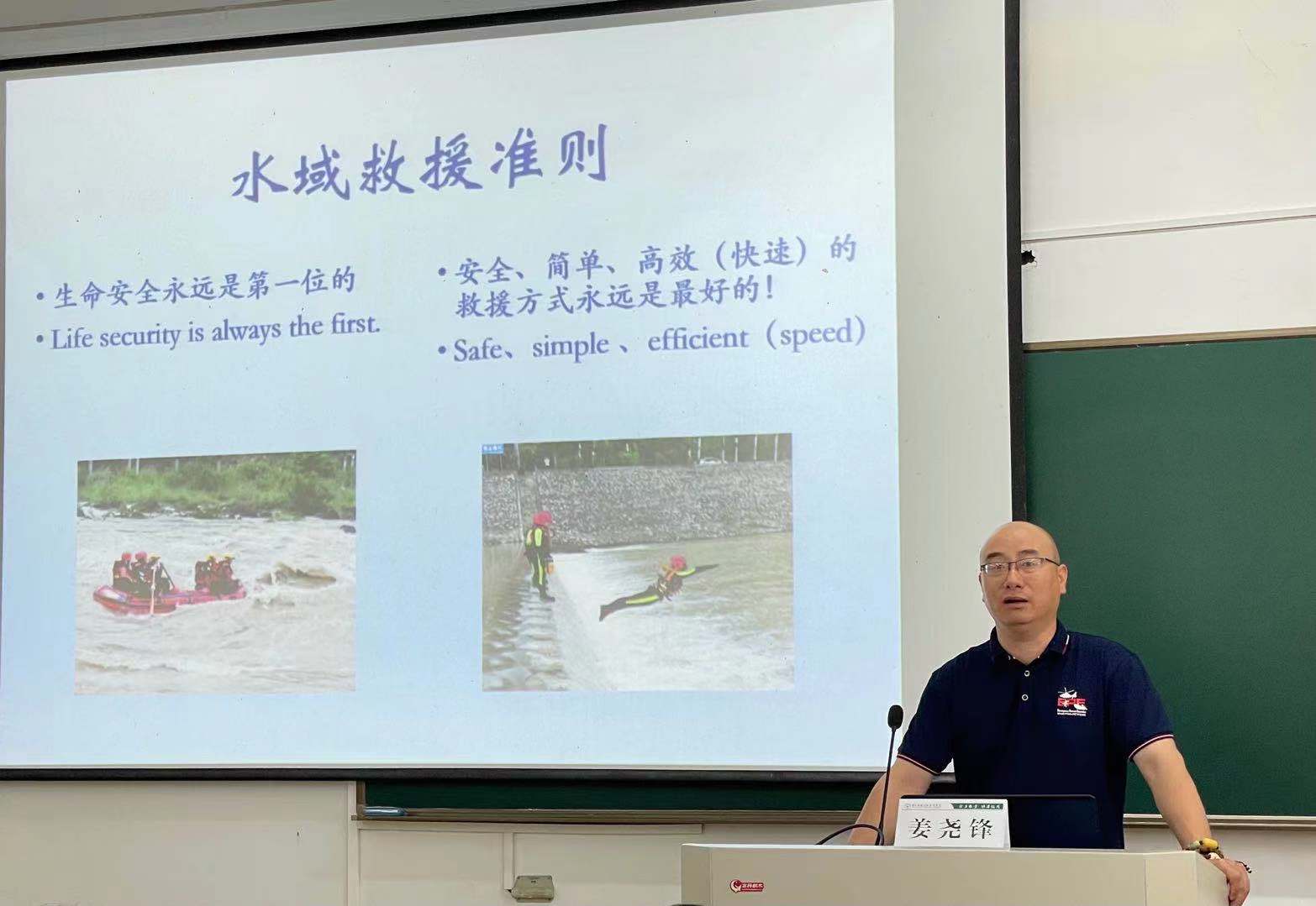 水上救援专家姜尧锋为全体学员开展了“课堂+实操”的授课形势。课上,姜尧锋用丰富的专业知识和实战经验, 从水域辨别、安全准则、急流救援技术、水域救援装备、急流救生队伍部署、危险因素、基本绳结应用与操作等水域救援知识进行讲解,并实地示范平跳式入水、救援艇操作和救援绳包抛投,针对重点、难点及易犯错的细节,组织学员们分组进行操作训练。从理论与实践两方面教授大家做好水上应急救援的专业知识及技能。