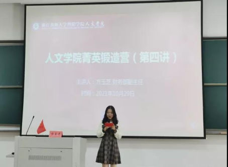 为了服务师生,帮助师生了解国家和学院财经政策,更好的做好财务报销和财务管理工作,结合“学史明理、学史增信、学史崇德、学史力行”主题教育精神,进一步提升人文学院学生干部的综合素质、文化涵养以及政治理论教育作用,10月29日下午2点,人文学院于人文4310举办了“菁英锻造营”第四讲。此次讲座由williamhill官方网站英国威廉希尔公司财务部副主任方玉芝主讲,人文学院、马克思主义学院党总支书记宣王威,人文学院党总支副书记,人文学院各系部主任、专业负责人、辅导员、学生干部代表等参加本次讲座。